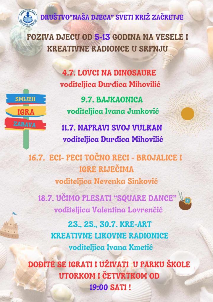 Već tradicionalne radionice priprema Društvo "Naša djeca" Sveti Križ Začretje u srpnju i nudi djeci zabavne, poučne i kreativne sadržaje. Igra, veselje i zanimljivi zadaci u radionicama djeci će obogatiti slobodno vrijeme i ljetne praznike učiniti zanimljivim. Utorkom i četvrtkom u 19 h u parku kod škole očekuju volonterke DND-a zaigrane radoznalce.