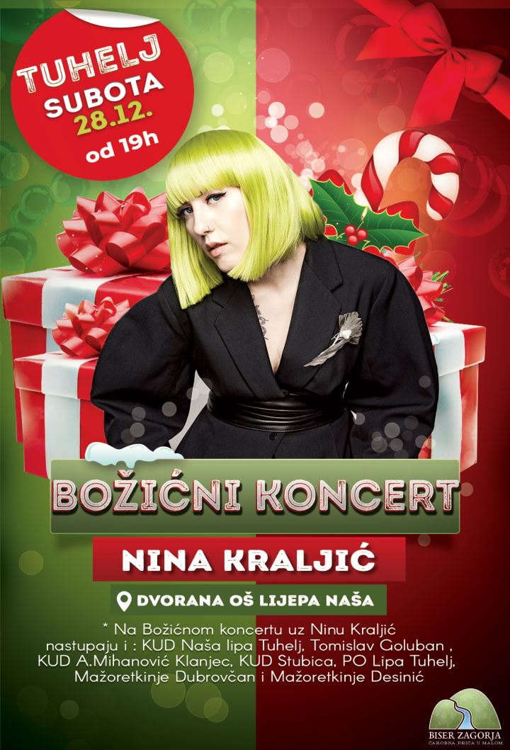 U dvorani OŠ Lijepa naša u subotu 28. prosinca od 19 sati održat će se Božićni koncert na kojem će glavna gošća biti Nina Kraljić. Uz nju će nastupiti KUD Naša lipa Tuhelj, Tomislav Goluban, KUD A. Mihanović Klanjec, KUD Stubica, PO Lipa Tuhelj, Mažoretkinje Dubrovčan i Mažoretkinje Desinić.