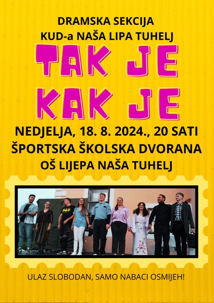 Nakon što je KUD Naša lipa Tuhelj u sklopu Summerfesta odradio prvi zajednički koncert s Puhačkim orkestrom Lipa Tuhelj, dramska sekcija KUD-a odlučila vas je počastiti besplatnim upadom na svoju predstavu 'Tak je, kak je'.
