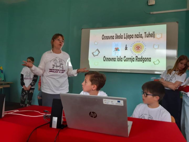 U petak su gosti iz Slovenije stigli u posjet Zagorju. Nakon obilaska Muzeja krapinskih neandertalaca, u školi je organiziran prikaz cjelokupnih aktivnosti ostvarenih u obje škole. I slovenski i hrvatski vršnjaci bili su vrlo kreativni u istraživanju književnih likova: kroz glazbenu, filmsku i likovnu umjetnost; u oblikovanju straničnika za knjige, kroz strip i izradu mozgalica i rebusa te izradu zajedničkog loga projekta koji je otisnut na majicama i šalicama za sve sudionike projekta kao suvenir – uspomena na zajednički projekt.
