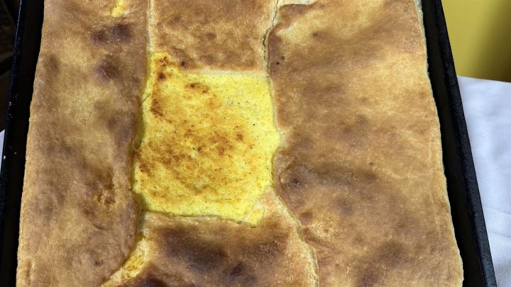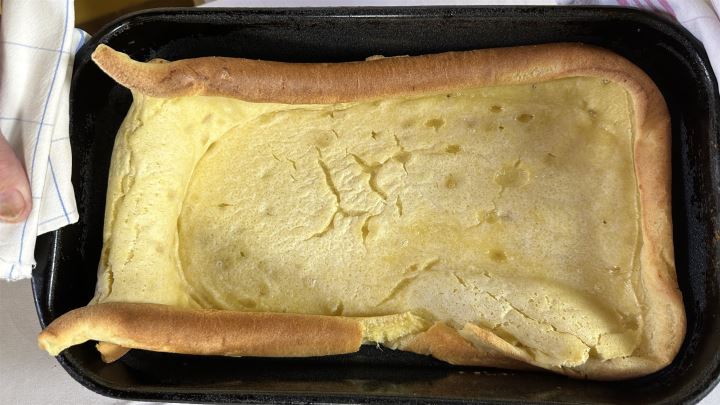 Sve sastojke dobro izmiksajte kao smjesu za palačinke te ulijte u namašćeni lim za pečenje. Pecite na 180 stupnjeva C oko 15-20 minuta dok se ne napuhne i ne zažari.