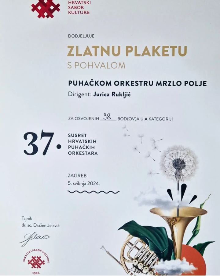 U nedjelju, 5. svibnja, održan je 37. Susret hrvatskih puhačkih orkestara u A kategoriji. Susret je održan u Maloj dvorani Vatroslava Lisinskog u Zagrebu. Fantastičan uspjeh postigao je Puhački orkestar Mrzlo Polje, koji je sa visokih 98 bodova osvojio Zlatnu plaketu s pohvalom i prvu nagradu.