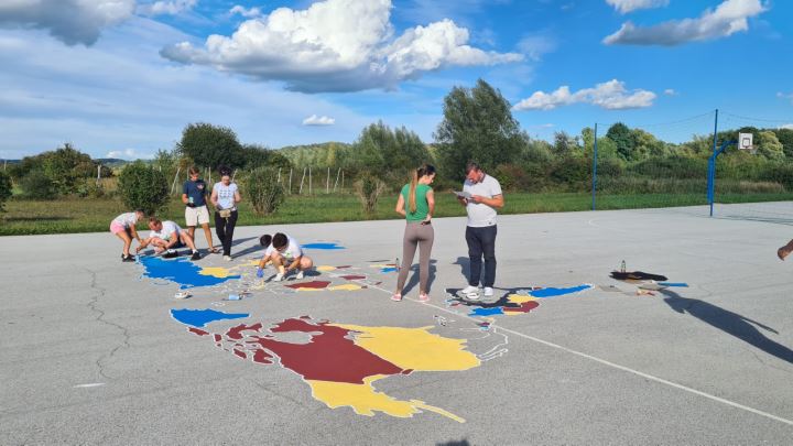 Od spomenutih financijskih resursa nabavljeni su putem interneta šablona za ocrtavanje karte svijeta, boje za beton i popratne materijale, izrađeni su plakati i zajedno sa svojim sumještanima realizirana je dugo planirana ideja da se školsko igralište ukrasi jednom kartom svijeta.