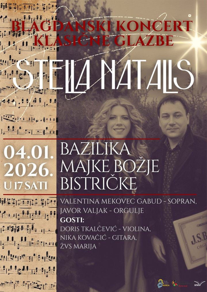 U nedjelju, 4. siječnja 2026. godine, u 17 sati, u Bazilici Majke Božje Bistričke održat će se blagdanski koncert klasične glazbe „Stella Natalis“, posvećen otajstvu Božića i svjetlu koje se objavljuje u susretu s Bogom. Koncert se održava ususret blagdanu Sveta Tri Kralja te je zamišljen kao meditativna glazbena večer, u kojoj se glazba i molitva isprepliću u tihom, kontemplativnom ozračju marijanskog svetišta.