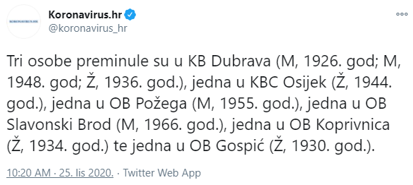 Od 25. veljače 2020., kada je zabilježen prvi slučaj zaraze u Hrvatskoj, do danas ukupno je zabilježeno 36380 osoba zaraženih novim koronavirusom, od kojih je 437 preminulo, ukupno se oporavilo 24799 osoba od toga 1014 u posljednja 24 sata. U samoizolaciji je trenutno 28177 osoba. Do danas je ukupno testirano 445 568 osoba, od toga 8520 u posljednja 24 sata, stoji u priopćenju Nacionalnog stožera.