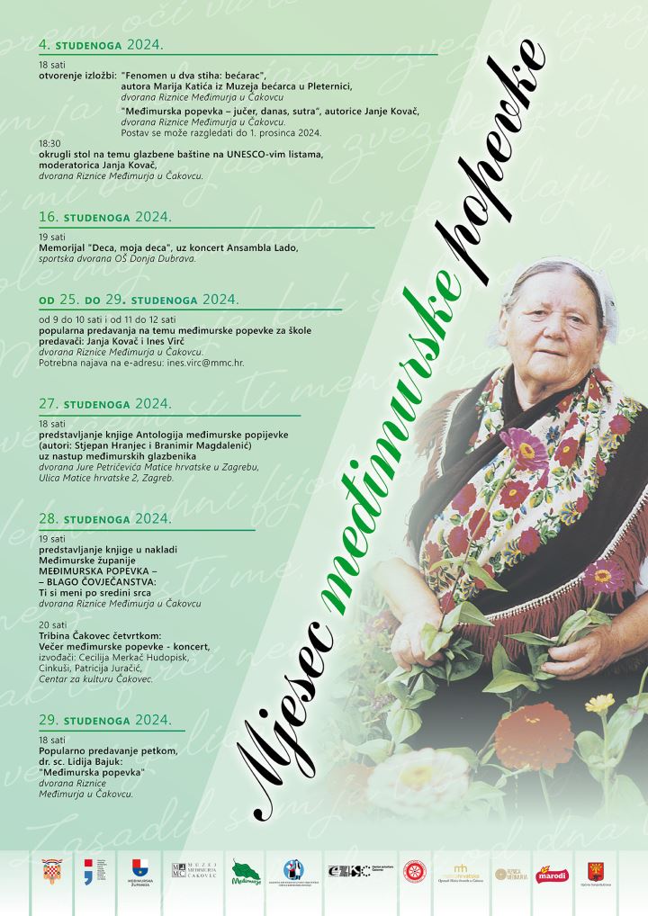 Mjesec međimurske popevke počinje 4. studenoga 2024. u 18 sati kada će se u dvorani Riznice Međimurja otvoriti zanimljiva izložba dvaju baština : Fenomen u dva stiha: bećarac, te Međimurska popevka – jučer, danas, sutra.