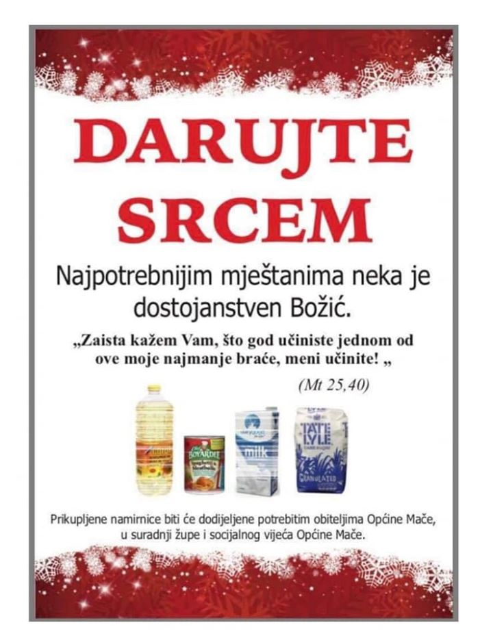 U općini Mače započela je još jedna akcija pod nazivom ‘Darujmo srcem’, kako bi se onima koji su se našli u teškoj životnoj akciji, a o tome skromno šute, uljepšali božićni blagdani. - Već tradicionalno, u našim lokalnim trgovinama nalaze se kutije u koje možete staviti svoj poklon od srca. Također, možete ga odnijeti u župni dvor kod našeg župnika. U suradnji Općine, Župe, Socijalnog vijeća i svih Vas mještana bit će složeni paketi za naše najpotrebitije žitelje. Učinimo im blagdane dostojanstvenijima – pozvala je načelnica Općine Mače Mladenka Mikulec Šimunec.