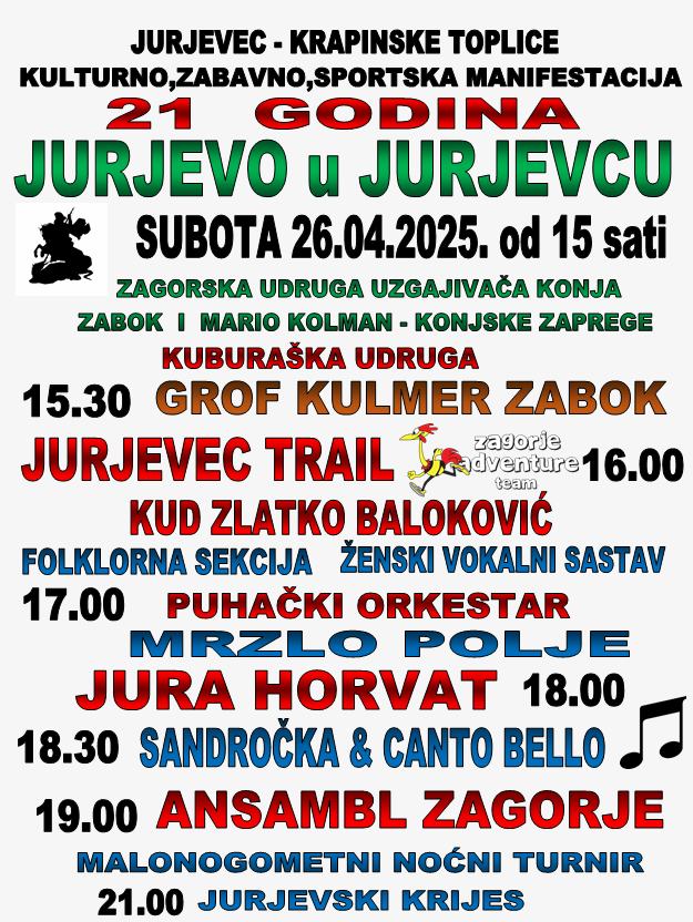 Na programu je i Jurjevec Trail, nastup KUD – a Zlatko Baloković, Grof Kulmer Zabok, nastup Puhačkog orkestra Mrzlo Polje, Jure Horvata, tu će biti i Sandročka i Canto Bello, zabava uz Ansambl Zagorje, malonogometni turnir i Jurjevski krijes.