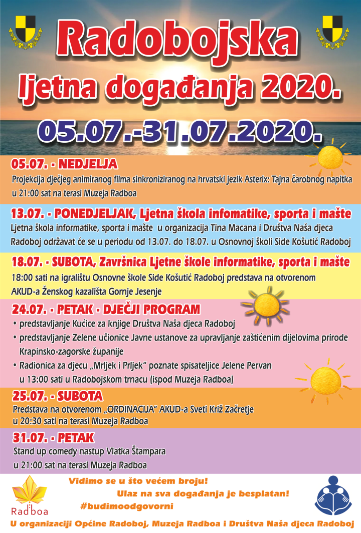 U ponedjeljak 13. srpnja u organizaciji Tina Macana i DND – a u OŠ Side Košutić Radoboj započinje Ljetna škola informatike, sporta i mašte, koja će se održavati do 18. srpnja, kada se od 18 sati na školskom igralištu održava predstava na otvorenom AKUD – a Ženskog kazališta Gornje Jesenje. U petak 24. srpnja na redu je dječji program – predstavljanje Kućice za knjige DND – a Radoboj, Zelene učionice Javne ustanove za upravljanje zaštićenim dijelovima prirode Krapinsko – zagorske županije, a održat će se i radionica za djecu 'Mrljek i Prljek' poznate spisateljice Jelene Pervan u 13 sati u Radobojskom trnacu.