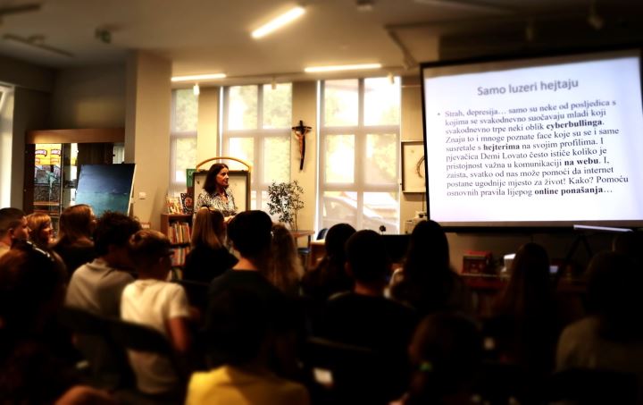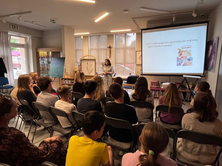 Engleske se riječi i izrazi nalaze svuda oko nas. Na radionici je prikazano kako ih treba promatrati u kontekstu u kojemu se upotrebljavaju (u žargonu, medijima, književnosti, zakonima). No, naglašeno je da ih u hrvatskome standardnom jeziku, osobito u formalnijoj komunikaciji, ipak treba izbjegavati. Voditeljica radionice učenike je upoznala s portalom 'Bolje je hrvatski', na kojemu se nalazi oko 300 prijedloga zamjena za česte anglizme, a i sami su mogli predložiti zamjene za neke od anglizama. Nakon radionice održano je Predavanje ''Engleski naš sveprisutni – O anglizmima u hrvatskome jeziku''.
