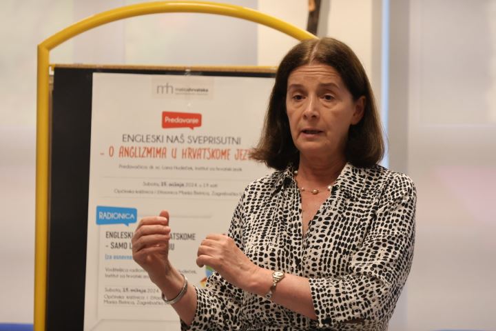 Predavačica je govorila o engleskim riječima i izrazima u hrvatskome jeziku, ukazavši da se utjecaj engleskoga može prepoznati na različitim jezičnim razinama, od pravopisne (npr. Europska Komisija umjesto Europska komisija) preko gramatičke (morfološke (npr. nesklanjanje pokrata), tvorbene (npr. kulturalni umjesto kulturni) i sintaktičke (npr. na dnevnoj bazi umjesto jednom dnevno / svakodnevno)) do one koja se najčešće spominje – razine riječi. Radno i slikovito anglizmi se mogu podijeliti na nekoliko skupina ovisno o tome koliko ih današnji izvorni govornik hrvatskoga jezika prepoznaje kao anglizme.
