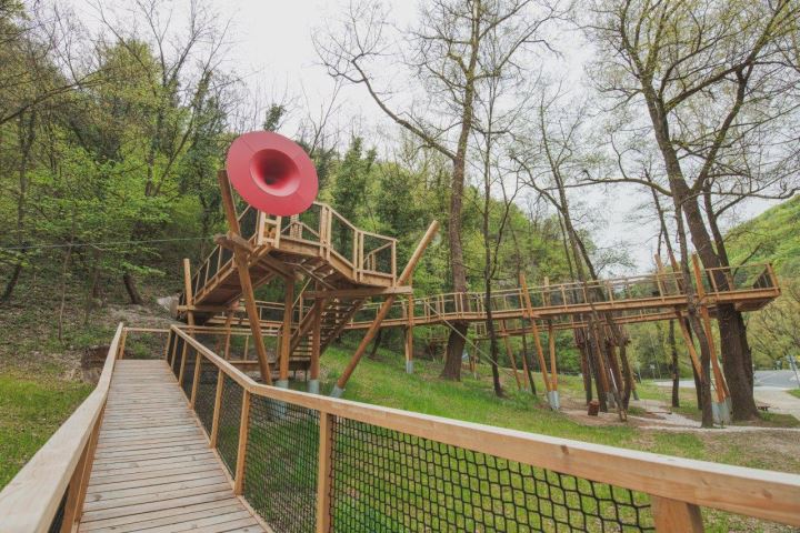 Staza kroz krošnje Zelenjak duga je 125 m s najvećom visinom od 5 m. Duž same staze nalazi se zanimljiva interpretacija biološke raznolikosti Značajnog krajobraza Zelenjak – Risvička i Cesarska gora. Tema bioraznolikost isprepliće s temom glazbe kroz skulpturu trube koja prati cijelu stazu, inspirirane ovim jedinstvenim lokalitetom i spomenikom himne Lijepa naša. Staza uključuje i promatračnicu za ptice u obliku ptičjega gnijezda i ljuljačke, dok podnožje staze krase perunike.