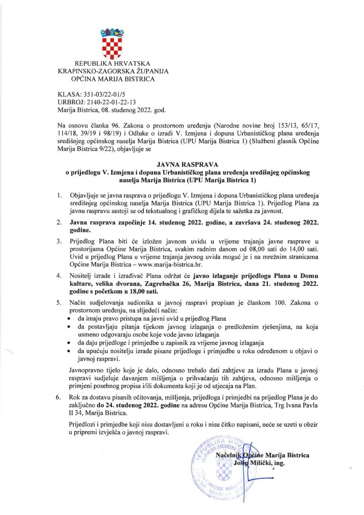 U Mariji Bistrici su objavljene dvije Javne rasprave vezane uz prostorno uređenje. Tako je objavljena Javna rasprava o prijedlogu V. Izmjena i dopuna Urbanističkog plana uređenja središnjeg općinskog naselja Marija Bistrica (UPU Marija Bistrica 1), ali i Javna rasprava o prijedlogu VI. Izmjena i dopuna Prostornog plana uređenja Općine Marija Bistrica (PPU Marija Bistrica). Obje rasprave traju od 14. do 24. studenoga, i za to su vrijeme oba Prijedloga planova izložena javnom uvidu u prostorijama Općine Marija Bistrica, svakim radnim danom od 08,00 sati do 14,00 sati, kao i na mrežnim stranicama Općine Marija Bistrica. Nositelj izrade i izrađivač Plana održat će javno izlaganje prijedlozima planova u Domu kulture u Mariji Bistrici u ponedjeljak 21. studenoga, za Izmjene i dopuna Prostornog plana uređenja Općine Marija Bistrica u 16.30 sati, a za Izmjene i dopune Urbanističkog plana uređenja središnjeg općinskog naselja Marija Bistrica u 18 sati. Rok za dostavu pisanih očitovanja, mišljenja, prijedloga i primjedbi na prijedloge Planova je do zaključno do 24. studenoga na adresu Općine Marija Bistrica, Trg Ivana Pavla II 34, Marija Bistrica. Prijedlozi i primjedbe koji nisu dostavljeni u roku i nisu čitko napisani, neće se uzeti u obzir u pripremi izvješća o javnoj raspravi.