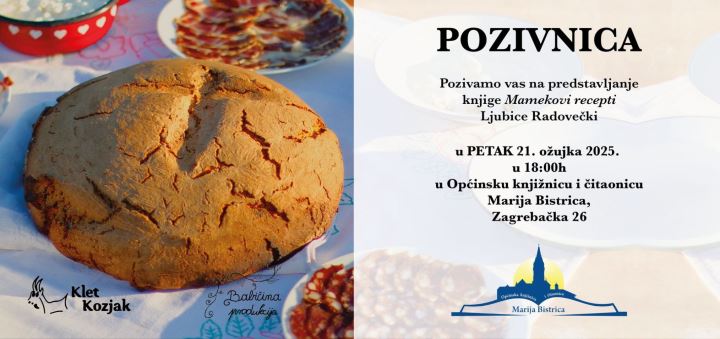 U Općinskoj knjižnici i čitaonici Marija Bistrica u petak 21. ožujka, s početkom u 18 sati na rasporedu je predstavljanje knjige ''Mamekovi recepti'' autorice Ljubice Radovečki.