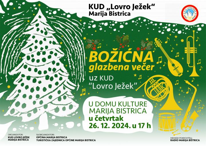 Iako je iza nas i četvrti Adventski vikend, događaja u sklopu ''Adventa u Mariji Bistrici'' ima još. Već na Štefanje na rasporedu je tradicionalna Glazbena večer uz KUD ''Lovro Ježek'' Marija Bistrica, u Domu kulture u Mariji Bistrici. Nastupit će sve sekcije KUD-a: i to četiri folklorne: Tičeki, Srčeka, Žveglice i Ježi, zatim mala i velika limena glazba, mali i veliki tamburaši i Mali vokalni sastav ''Ježice''. Početak je u 17 sati.