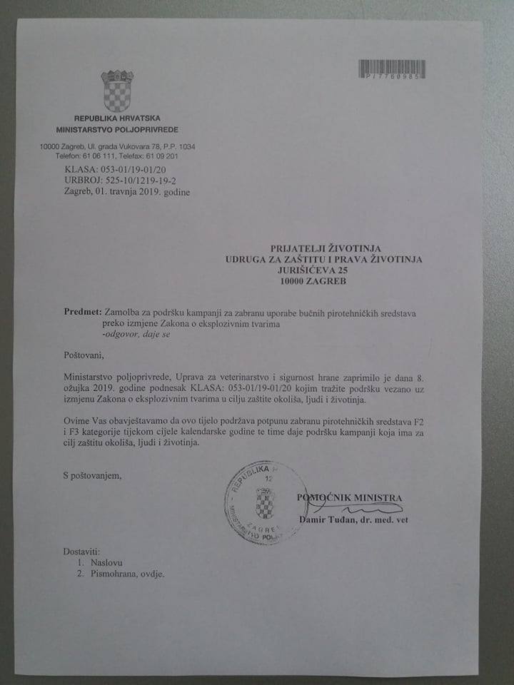Nakon Ministarstva znanosti i obrazovanja, Ministarstva turizma, Ministarstva zdravstva i Ministarstva gospodarstva, poduzetništva i obrta, Ministarstvo poljoprivrede peto je u nizu koje je podržalo zabranu korištenja petardi tijekom cijele godine u cilju zaštite ljudi, životinja i okoliša te održavanja sigurnosti i mira. Udruga Prijatelji životinja smatra ove podrške daljnjim napretkom na putu prema uvođenju potpune zabrane korištenja petardi. To već godinama traže građani, udruge za zaštitu životinja, liječnici te druge skupine građana uznemirene bukom petardi i posljedicama njihova korištenja.