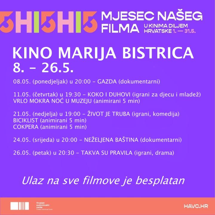 Kino Marija Bistrica pridružuje se obilježavanju Mjeseca našeg filma i donosi niz potpuno besplatnih projekcija. Tako je u ponedjeljak 8. svibnja u 20 sati na rasporedu dokumentarni film ''Gazda'', a u četvrtak 11. svibnja od 19.30 sati može se pogledati igrani film za djecu i mladež ''Koko i duhovi'', kao i kratki animirani film ''Vrlo mokra noć u muzeju''. U nedjelju 21. svibnja na rasporedu su od 19 sati čak tri filma. Prvo će se moći pogledati igrani film i to komedija ''Život je truba'', a nakon njega i dva kratka animirana filma ''Biciklist'' i ''Cokpera''. U srijedu 24. svibnja na programu je od 20 sati dokumentarni film ''Neželjena baština'', a u petak 26. svibnja od 20.30 sati igrani film – drama ''Takva su pravila''. Ulaz na sve projekcije je besplatan.
