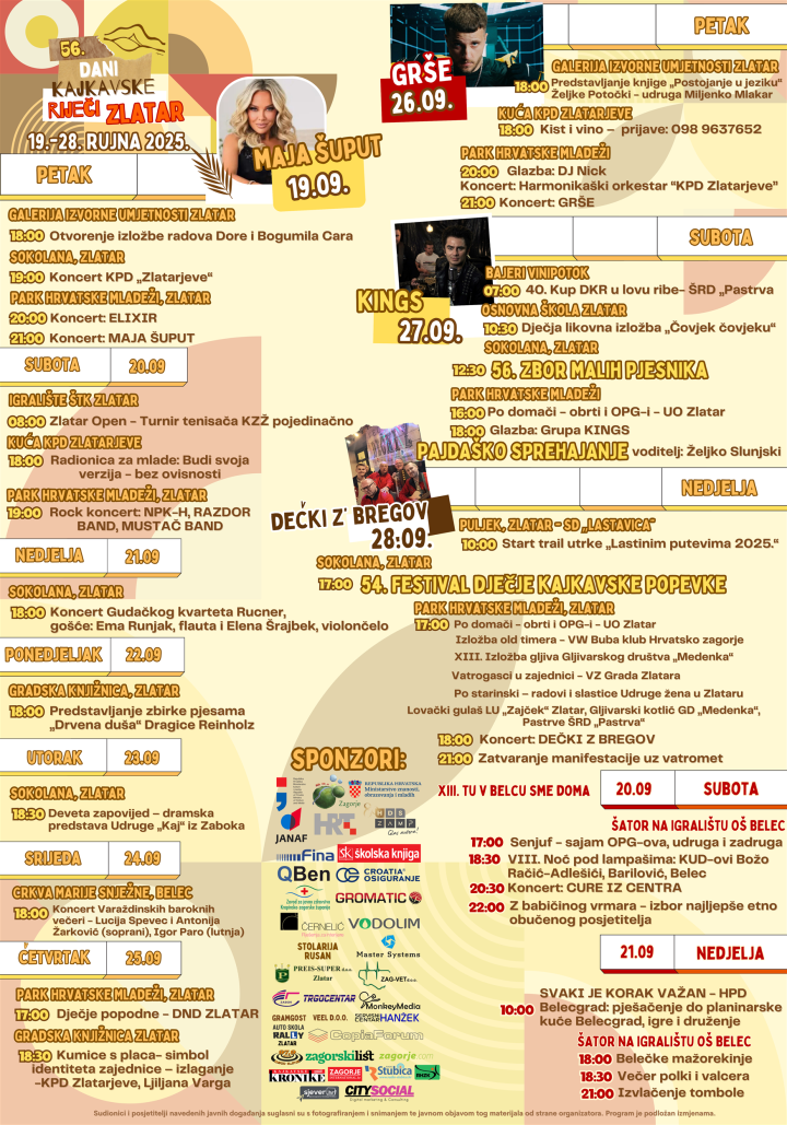 Kulturni program manifestacije koordinira Pučko otvoreno učilište dr. Jurja Žerjavića Zlatar. Gordana Valjak, ravnateljica Pučkog učilišta ističe tradicionalne dječje kajkavske priredbe koje su prepoznatljiv dio manifestacije i njen zaštitni znak, a ove će godine u Zlataru okupiti stotinjak osnovnih škola na tri priredbe koje objedinjavaju likovno, literarno i glazbeno stvaralaštvo učenika osnovnih škola kajkavske Hrvatske.