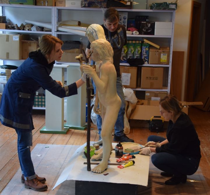 Od kraja 80-tih su postepeno, kroz vrijeme, sve skulpture odlijane u bronci. Prve brončane skulpture bile su one koje prikazuju neandertalce te su postavljene na istom mjestu na samom Nalazištu, a stare su 90-tih godina popravljene i obojane te smještene u unutrašnji prostor starog stalnog postava Muzeja evolucije. Prošle i ove godine, idući ususret 50. obljetnici muzejske djelatnosti na Hušnjakovu, stare rekonstrukcije neandertalskih dječaka i majke neandertalke uz ognjište, nakon najnovije obnove, zasjale su opet novim, pomalo drugačijim sjajem. Obnovu skulptura inicirao je Jurica Sabol, novi ravnatelj Muzeja Hrvatskog zagorja, a na njima su radili djelatnici Petra Šoltić, Siniša Laginja i Lorka Lončar Uvodić.