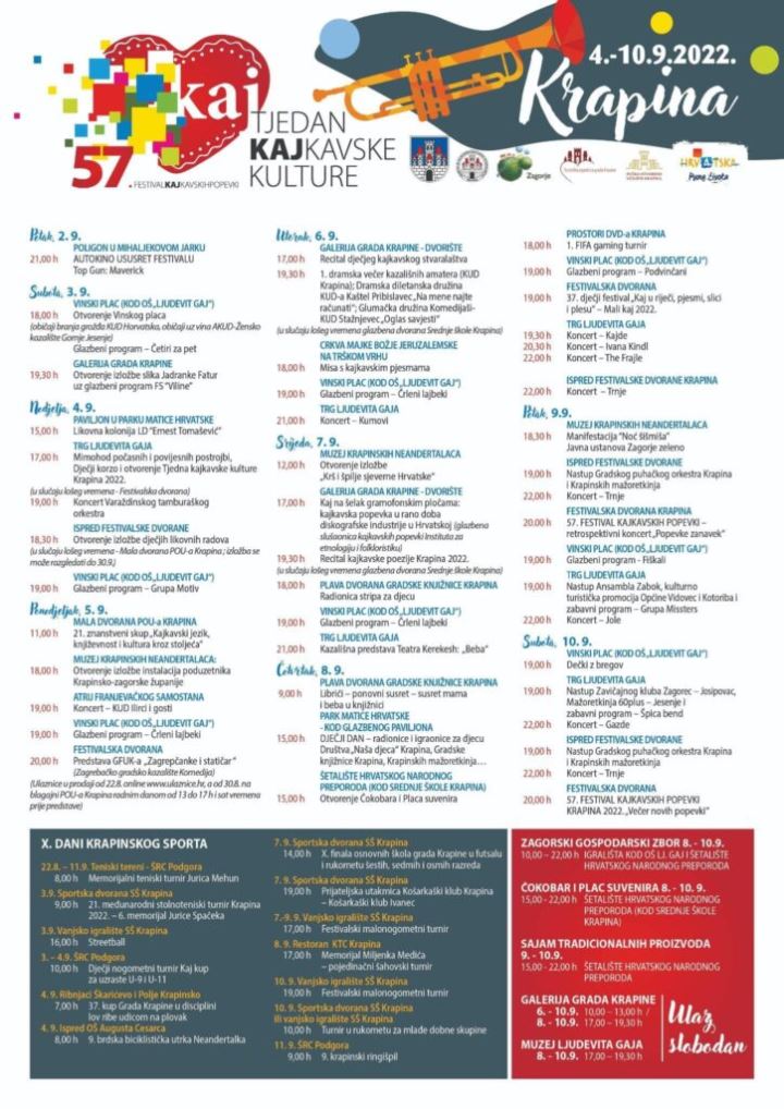 Od sutra, Krapina će živjeti u duhu ‘kaja’. U nedjelju se otvara 57. Tjedan kajkavske kulture, najvažnija kajkavska kulturna manifestacija. Svečano otvorenje posbenog krapinskog Tjedna bit će u 17 sati na Trgu Ljudevita Gaja, a u slučaju kiše, u Festivalskoj dvorani. Otvorenju će prethoditi mimohod počasnih i povijesnih postrojbi te Dječji korzo.