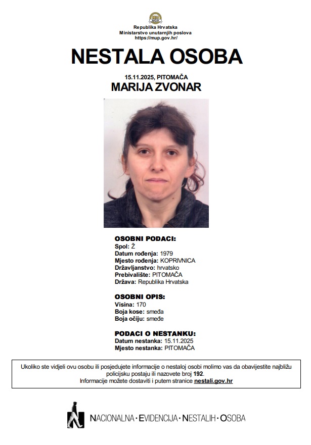Već šest dana policija i obitelj tragaju za Marijom Zvonar (46), koja se u subotu, 15. studenog, udaljila s adrese prebivališta u Pitomači.