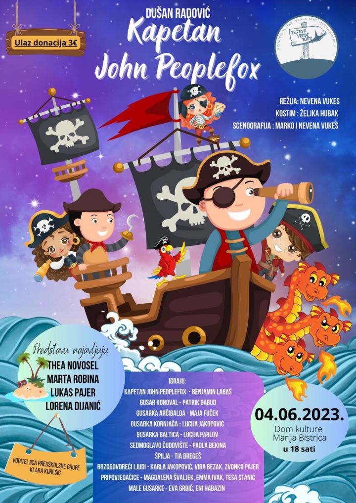 Bistrički teatar ''Vende tam'' donosi novu predstavu i to svoje najmanje skupina. Predstava ''Kapetan John Peoplefox'', Dušana Radovića, u režiji voditeljice ovog teatra Nevene Vukes na rasporedu je u nedjelju 4. lipnja u 18 sati u Domu kulture u Mariji Bistrici. Jedna hrabra gusarska priča odvest će vas do dalekog žutog Kineskog mora u kome živi straaašno čudovište sa 7 glava! Ali naš kapetan John Peoplefox i njegova hrabra posada odlazi riješiti ovaj sitan problem. Predstava je namijenjena djeci od četiri godine i starijoj. Glume: Benjamin Labaš, Patrik Gabud, Maja Fuček, Lucija Jakopović, Lucija Parlov, Paola Bekina, Tia Bregeš, Karla Jakopović, Vida Bezak, Zvonko Pajer, Magdalena Švaljek, Emma Ivak, Tesa Stanić, Eva Grbić i Eni Habazin, a predstavu najavljuju polaznici predškolske grupe koju odi Klara Kurešić: Thea Novosel, Marta Robina, Lukas Pajer i Lorena Dijanić. Za kostime je zadužena Željka Hubak, a za scenografiju Marko i Nevena Vukes. Cijena ulaznice je donacija od 3 eura.