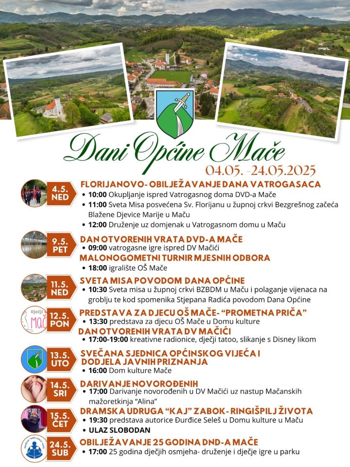 U nedjelju, 11. svibnja, najavljena je svečana sveta misa povodom Dana općine u Župnoj crkvi te polaganje vijenaca na groblju te kod spomenika Stjepanu Radiću. Ponedjeljak, 12. svibnja, rezerviran je za najmlađe — u Domu kulture izvest će se predstava„Prometna priča“ za učenike OŠ Mače, a istoga dana od 17 do 19 sati svoja vrata otvara DV Mačići, uz kreativne radionice, oslikavanje lica i druženje s Disney likom. Svečana sjednica s dodjelom javnih općinskih priznanja zakazana je na sam Dan Općine Mače, u utorak, 13. svibnja u 16 sati u domu kulture. Dan poslije u Dječjem vrtiću slijedi darivanje novorođenih; u četvrtak, 15. svibnja gostuje Dramska udruga KAJ iz Zaboka s predstavom „Ringišpil života“, uz besplatan ulaz, a program završava 24. svibnja, proslavom 25 godina DND-a Mače.
