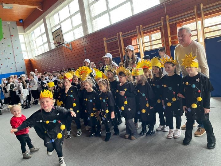 Na pozornici je nastupilo osam skupina: DV Škrinjica – „Zvjezdice“, PŠ Jazvine, PŠ Gornja Šemnica, 1.a razred, 2.a razred, 3. i 4.a razred, 5.a i 5.b razred te 7.a razred. Publika je uživala u svemirskim Zvjezdicama koje su donijele čaroliju svemira, veselim „Tic tac“ bombončićima iz Jazvina, kokicama i šećernoj vati iz Gornje Šemnice, razigranim pčelicama i bumbarima 1.a razreda te tematskom nastupu 2.a razreda „Kina nekad i danas“, koji je prikazao spoj tradicije i suvremenosti. Učenici 3. i 4.a razreda izveli su dinamičan „klavirski ples“, dok su 5.a i 5.b razred rasplesali dvoranu uz hit Rim Tim Tagi Dim izvođača Baby Lasagna. Program su zaključili duhoviti „Šeikovi iz Dubaija“ iz 7.a razreda.