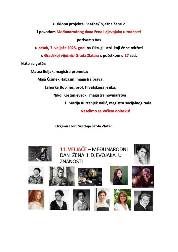 U sklopu projekta „Snažne/Nježne žene 2”, koji se provodi u Srednjoj školi Zlatar, u petak, 7. veljače, u Gradskoj vijećnici u Zlataru, s početkom u 17 sati, organizira se okrugli stol, na kojem će gošće biti pet žena koje se profesionalno bave različitim područjima i podijelit će svoja iskustva.