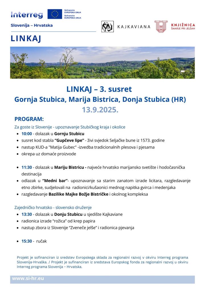 Kajkaviana najavljuje Treći susret u sklopu Interreg projekta LINKAJ, koji provodi zajedno s Knjižnicom Šmarje pri Jelšah iz Slovenije u okviru Interreg programa Slovenija – Hrvatska. Susret će se održati u Kajkaviani u Donjoj Stubici u subotu, 13. rujna 2025. godine s početkom u 13:30 sati.