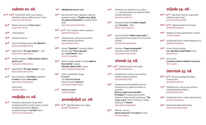 U petak 26. kolovoza u 20.30 sati je prva večer Festivala s kajkavskim pjesmama, a nakon toga koncert TS Najbolji hrvatski tamburaši, a u subotu 27. kolovoza na redu su zabavne pjesme na Festivalu te nakon toga koncert Zorice Kondže.