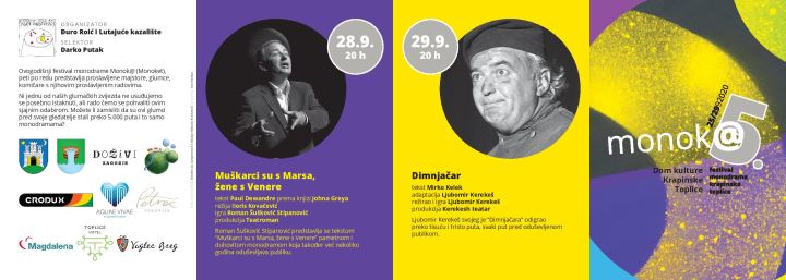 Danas započinje peto izdanje festivala monodrame Monok@, koji će se do 29. rujna održavati u Domu kulture u Krapinskim Toplicama. Iako u drugačijim, otežanim okolnostima, festival i ove godine donosi bogat i zanimljiv program, i to u veselom tonu.