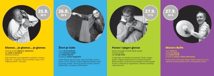 Festival započinje predstavom „Glumac...je glumac....je glumac”, autorskim projektom Zijaha A. Sokolovića danas, 25. rujna u 20 sati. Idućeg je dana na redu predstava „Život je čudo” u izvedbi Siniše Popovića, a u nedjelju, 27.