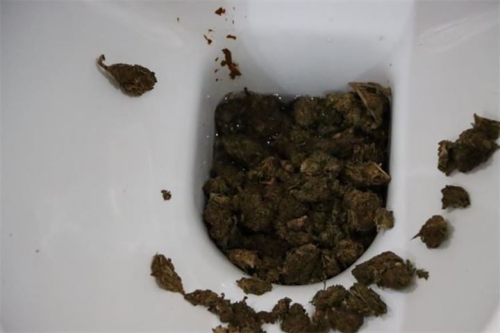 Tijekom ulaska u kuću, policajci su zatekli 33-godišnju ženu kako pokušava uništiti dokaze. Vrećice s drogom istresala je u WC školjku, a naknadno je utvrđeno da je, na nagovor supruga, u kanalizaciju bacila najmanje 70 grama kokaina i 367 grama marihuane. Policajci su rastavljanjem kanalizacijskih cijevi pronašli gotovo svu bačenu drogu.