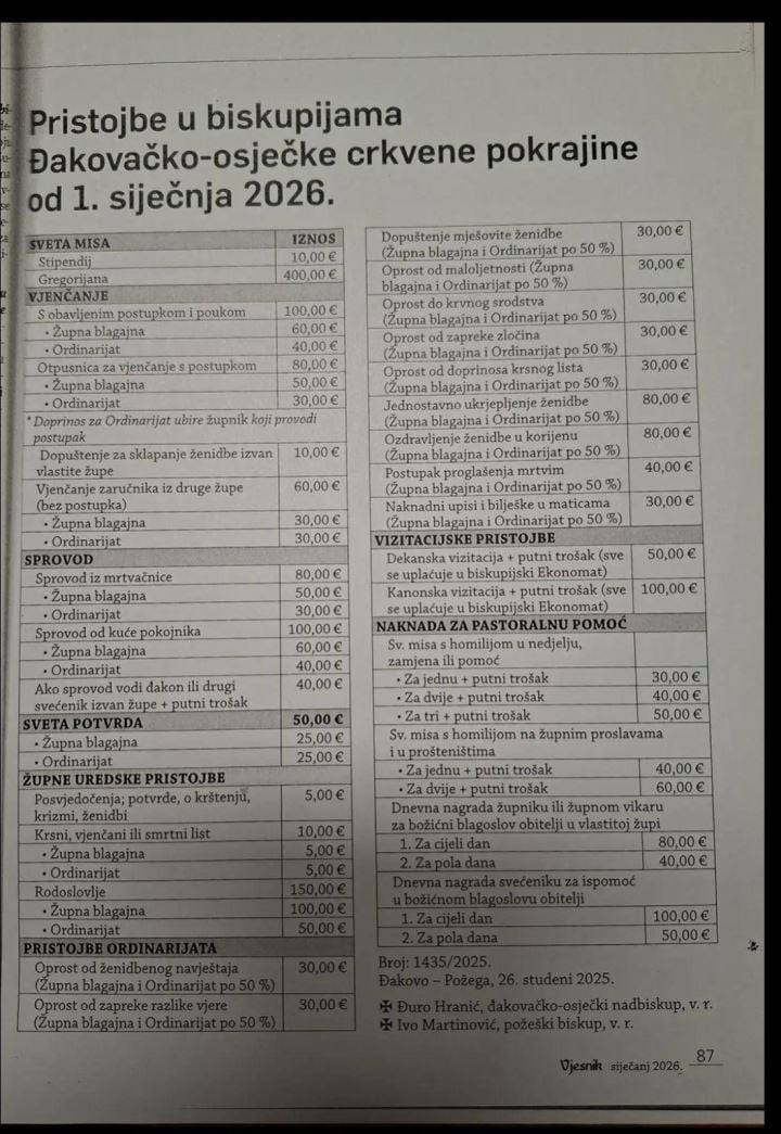 Od 1. siječnja skuplje su crkvene pristojbe u Hrvatskoj. Tako se može iščitati iz novih cijena pristojbi u biskupijama Đakovačko-osječke crkvene pokrajine. Cjenik koji je stupio na snagu ove godine zajednički potpisuju đakovačko-osječki nadbiskup Đuro Hranić i požeški biskup Ivo Martinović, objavila je Danica.