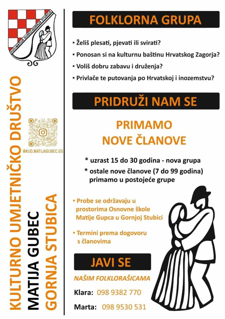 Želiš plesati, pjevati ili svirati? Ponosan si na kulturno baštinu Hrvatskog zagorja? Voliš dobru zabavu i druženja? Privlače te putovanja po hrvatskoj i inozemst5vu? Pridruži nam se!, pozivaju iz gornjostubičkog KUD – a.