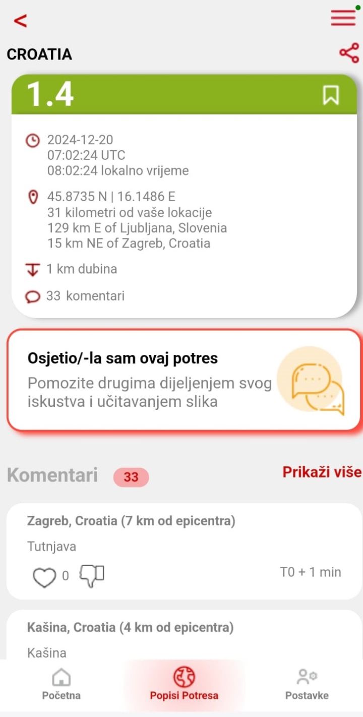 "Čula se tutnjava jeziva", "Par sekundi drmanja i zvuk kamenja", "Podrhtavanje trajanja par sekundi praćeno jakim tunjem u području Sesveta - Kašina", "Markovo polje, zatreslo je fino", javljali su građani.