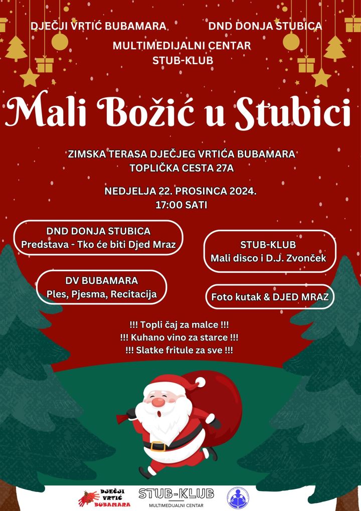 U organizaciji Društva naša djeca Donja Stubica, Dječjeg vrtića Bubamara i Multimedijalnog centra STUB-KLUB, u nedjelju 22. prosinca, održati će se po prvi put zimska manifestacija pod nazivom 'Mali Božić u Stubici'.