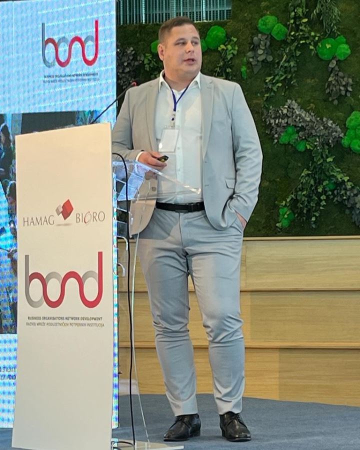 Mate Kovač, ravnatelj sektora u HAMAG-BICRO-u i Franjo Vukić, voditelj projekta BOND 2 predstavili su rezultate provedbe projekta BOND 2 te uspostavljenu Mrežu BOND koju trenutno sačinjava 96 poduzetničkih potpornih institucija, a najviše ih dolazi upravo iz Osječko-baranjske županije. Ostvareni rezultati projekta uvelike premašuju prvotno definirane pokazatelje – od zadanih 60 članova Mreže BOND, učlanjeno ih je 96, od zadane tri usluge, standardizirano ih je pet, od zadanih 50 mentora, okupljeno ih je 227 u mreži mentora, od zadanih pet mreža mentora, uspostavljeno ih je 27, od zadanih 15 certificiranih PPI-jeva, certificirano je njih 42, od zadanih 11 jedinica lokalne i regionalne samouprave iz kojih dolaze certificirani PPI-jevi, certifikatom je pokriveno 18 županija.