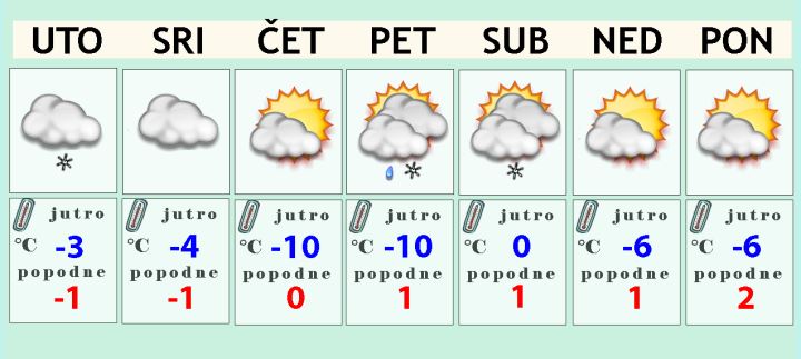 I tijekom utorka oblačno i hladno vrijeme. Povremeno će padati snijeg, čini se u prvom dijelu dana sitno i slabo, a kako se dan bliži kraju tako bi snijeg trebao pojačavati. Temperatura između -4 i -1 Celzijev stupanj.