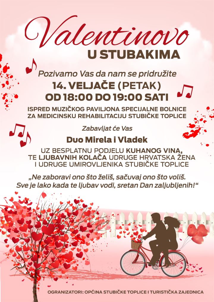 Turistička zajednica općine Stubičke Toplice organizira Velentinovo u Stubakima. Ispred muzičkog paviljona Specijalne bolnice za medicinsku rehabilitaciju Stubičke Toplice posjetitelje će zabavljati Duo Mirela i Vladek, uz besplatnu podjelu kuhanog vina te ljubavnih kolača Udruge Hrvatska žena i Udruge umirovljenika Stubičke Toplice. U Općinskoj knjižnici Stubaki održat će se književni susret s Gordanom Vlašić u 17 sati povodom Dana zaljubljenih, uz gosta urednika Hrvoja Kovačevića i glazbenu pratnju Doris Tkalčević. Tu je i dodatna ugostiteljska ponuda – Kavana Maksimilijan nudi ljubavne slastice, Temple bar prigodni menu u restoranu i burger bistrou uz nastup Boss banda, a hotel Matija Gubec slavi Valentinovo i 14. veljače uz nastup Luna benda i 15. veljače uz nastup Blue jeansa. Catering restoran Kapelščak uz prekrasni ljubavni ambijent nudi večer za dvoje uz kanape života, rižota nježnosti, ljubavne krokete i aparitive koji spajaju duše.
