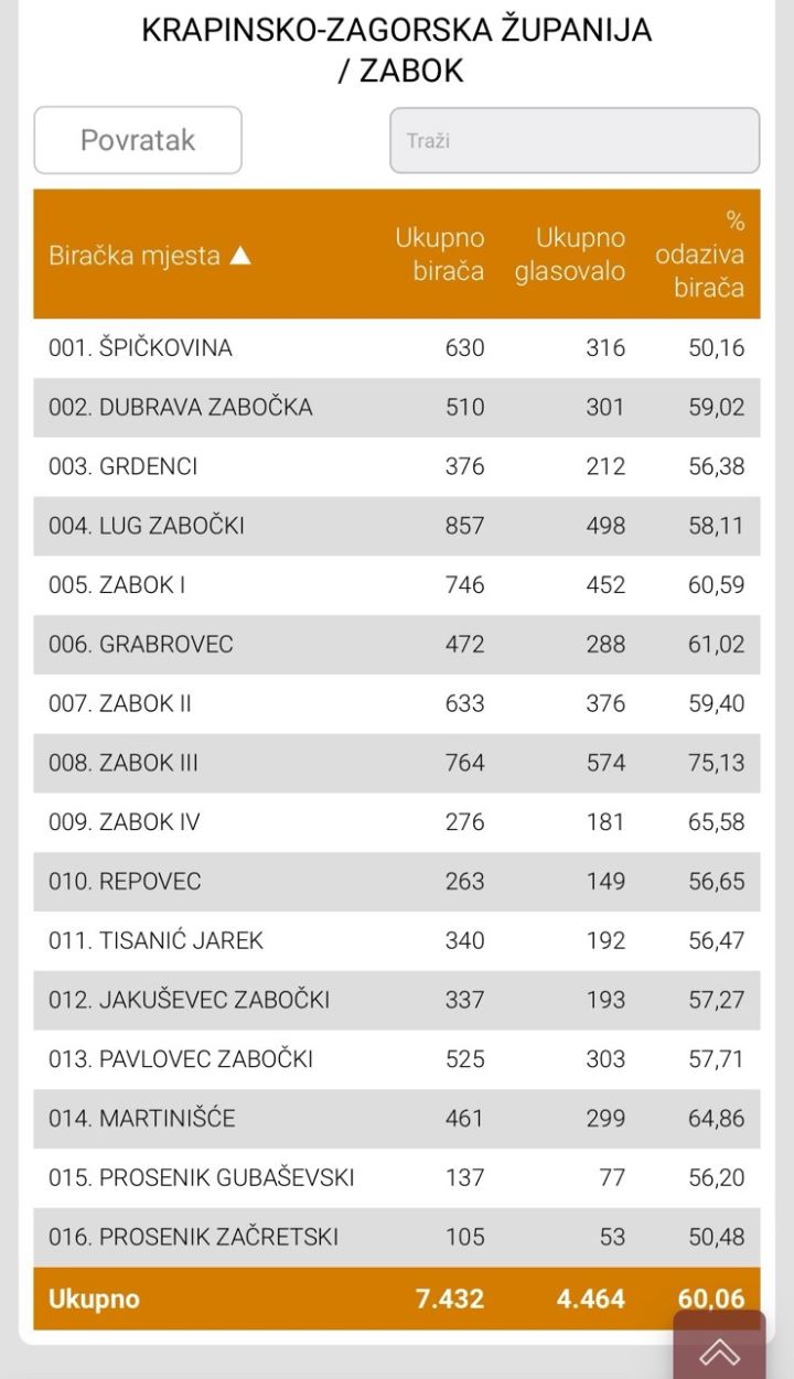 Na biračkom mjestu Zabok III, izlaznost do 16.30 je više od 75,13%. Naime, na tom je području 764 birača, od čega ih je ukupno glasovalo 574.