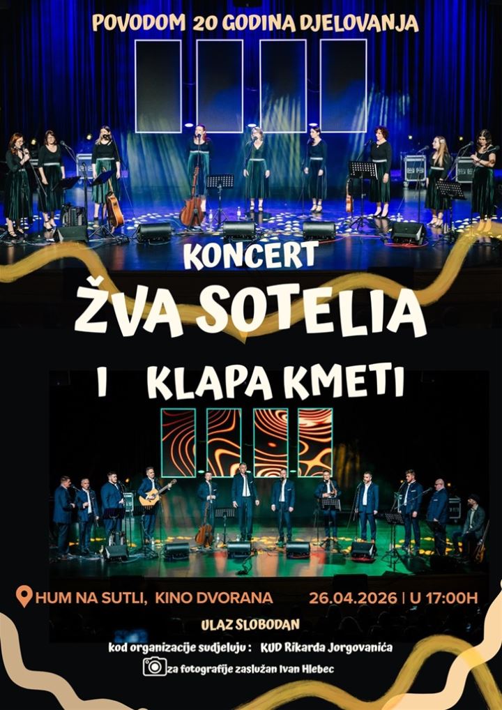 Ženska vokalna grupa Sotelia, koja djeluje u sklopu KUD-a Rikarda Jorgovanića, priređuje slavljenički koncert povodom 20 godina uspješnog djelovanja. Koncert će se održati u sklopu obilježavanja Dana općine Hum na Sutli, u nedjelju, 26. travnja 2026. godine, s početkom u 17 sati, u Kino dvorani Huma na Sutli.