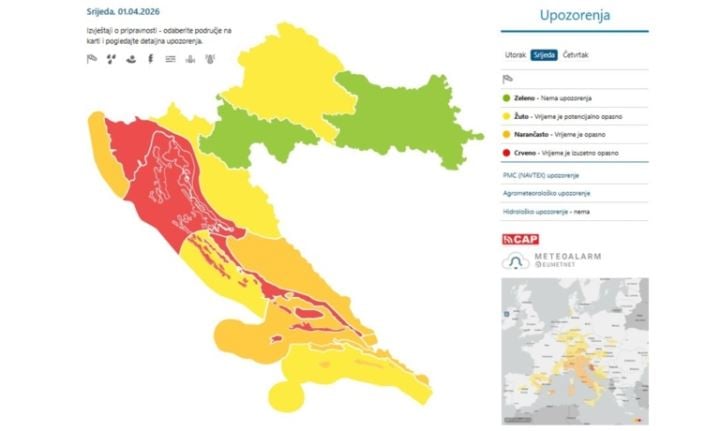 U srijedu su crveni meteoalarmi upaljeni u riječkoj i splitskoj regiji te Velebitskom kanalu zbog mjestimice olujnih i orkanskih udara bure. “Poduzmite mjere za samozaštitu. Postoji rizik za osobnu sigurnost zbog iščupanih stabala, polomljenih grana te letećih krhotina. Očekuju se rasprostranjena oštećenja konstrukcija, prekid prometa i prekid opskrbe energijom”, upozoravaju.