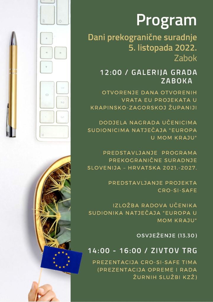 Iz ZARE pozivaju da se pridružite na otvorenju Dana otvorenih vrata EU projekata u Krapinsko – zagorskoj županiji u srijedu 5.10.2022.godine s početkom u 12:00 sati u prostoru Galerije grada Zaboka te na interaktivnom predstavljanju žurnih službi Krapinsko-zagorske županije koje počinje na Zivtovom trgu u 14,00 sati. Radi se o vježbama i prezentaciji opreme te rada naših vatrogasaca, hitne službe, policije, Županijskog centra 112, HGSS-a.