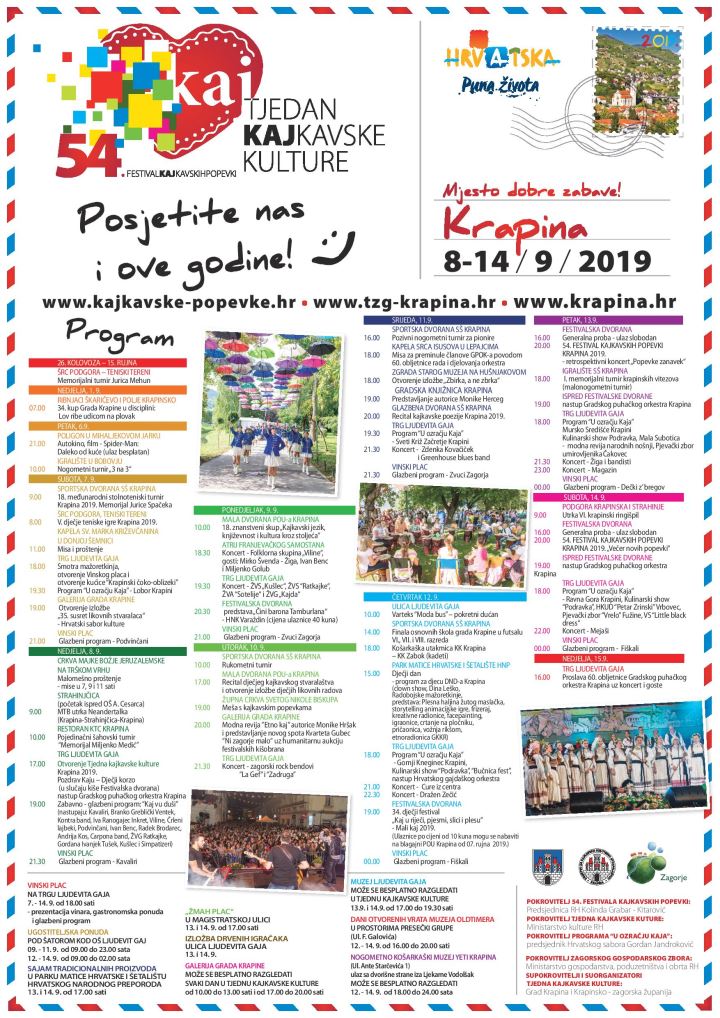 Iako se neka događanja planiraju već od 26. kolovoza, službeno otvorenje manifestacije bit će u nedjelju 8. rujna Pozdravom kaju i Dječjim korzom na Trgu Ljudevita Gaja u 17 sati. Biser Tjedan, 54. Festival kajkavskih popevki održat će se kroz dvije večeri, u petak 13. rujna održat će se retrospektivni koncert 'Popevke zanavek' s početkom u 20 sati u festivalskoj dvorani, a idućeg dana, u subotu, na redu je 'Večer novih popevki'. U sklopu Tjedna održat će se i 27. Zagorski gospodarski zbor, koji će trajati od 12. do 14. rujna. – Bit će tu brojnih kulturnih, zabavnih, sportskih sadržaja, a i novosti poput promocije Kvarteta Gubec u dvorištu Gradske galerije u utorak 10. rujna, gdje ćemo imati i jednu modnu reviju koju će nositi ravnateljice i direktorice krapinskih ustanova i tvrtki. Ne smijemo zaboraviti i humanitarnu aukciju unikatnih festivalskih kišobrana, oslikanih poput covera CD – a i ploča s Festivala od 1966. do 1990. godine, koja će se održati istog dana. Nako nekoliko godina vraćamo i tradiciju predstavljanja festivala iz Svetog Križa Začretja na našem trgu. Pozivam sve da dođu u Krapinu, na mjesto dobre zabave, gdje će svatko pronaći nešto za sebe – pozvao je Gregurović.