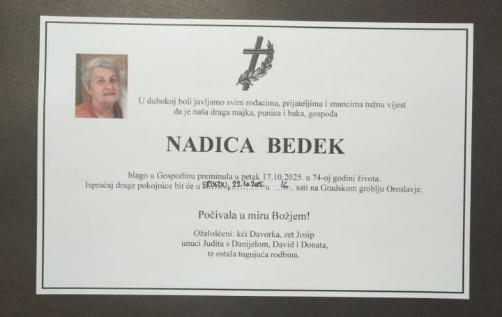 Posljednji ispraćaj preminule Nadice bit će u srijedu, 22. listopada u 16 sati, na Gradskom groblju u Oroslavju.