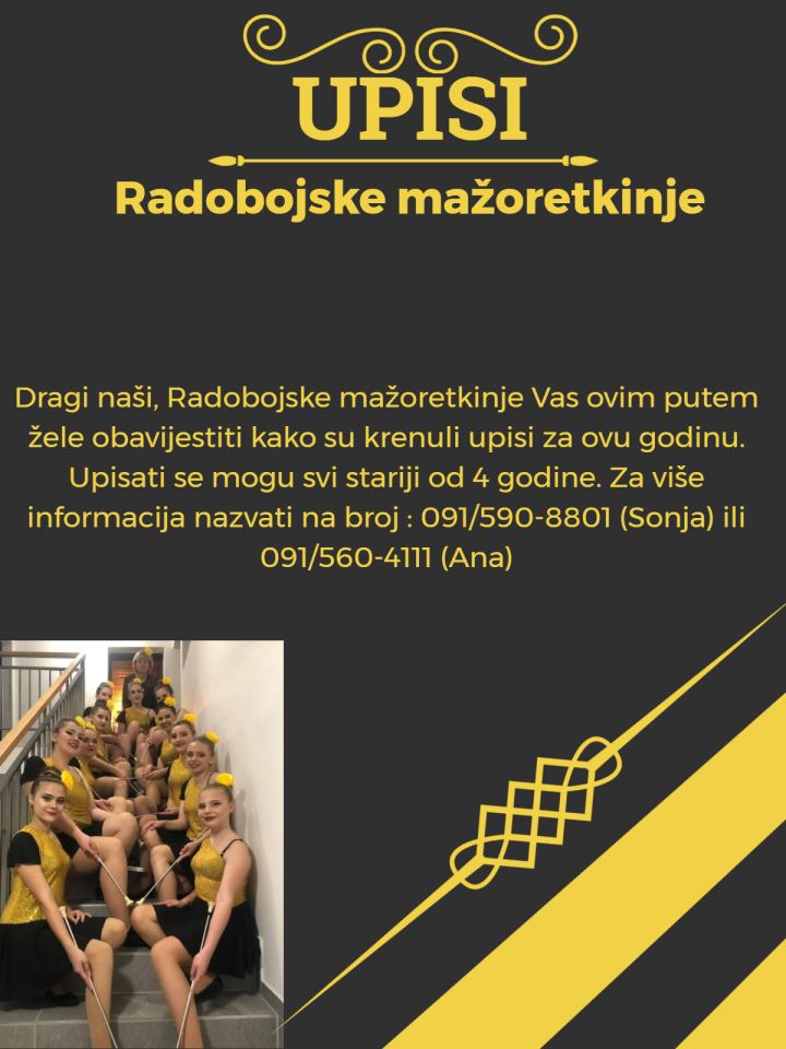 Radobojske mažoretkinje obavještavaju da su krenuli upisi za ovu godinu. U Radobojske mažoretkinje mogu se upisati svi stariji od 4 godine. Za više informacija možete nazvati na brojeve telefona: 091/590-8801 (Sonja) i 091/560-4111 (Ana).