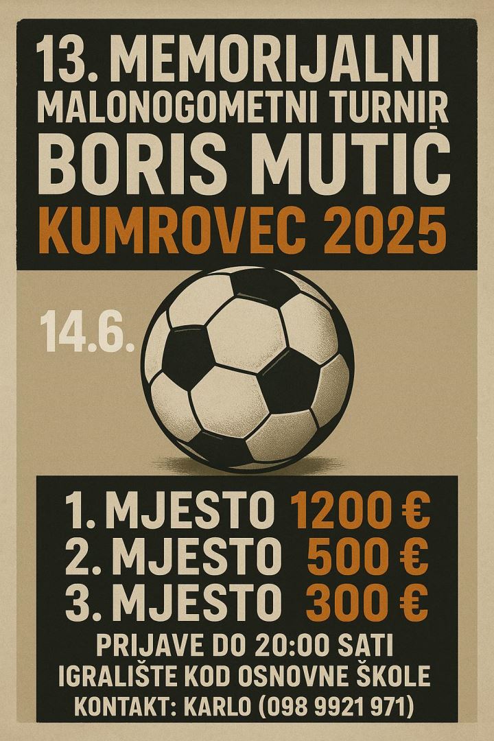 Sportski duh i sjećanje na veliku sportsku ličnost ponovno će ispuniti Kumrovec u subotu, 14. lipnja 2025. godine, kada se na igralištu Osnovne škole Josipa Broza održava 13. Memorijalni malonogometni turnir “Boris Mutić”, s početkom u 20 sati.