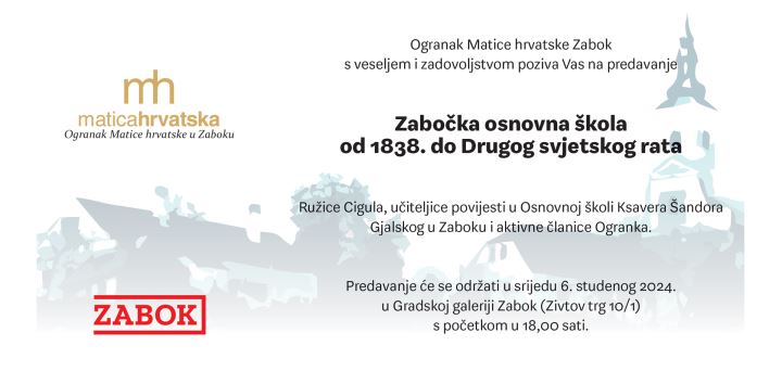 Ogranak Matice hrvatske Zabok s veseljem i zadovoljstvom poziva Vas na predavanje “Zabočka osnovna škola od 1838. do Drugog svjetskog rata”.